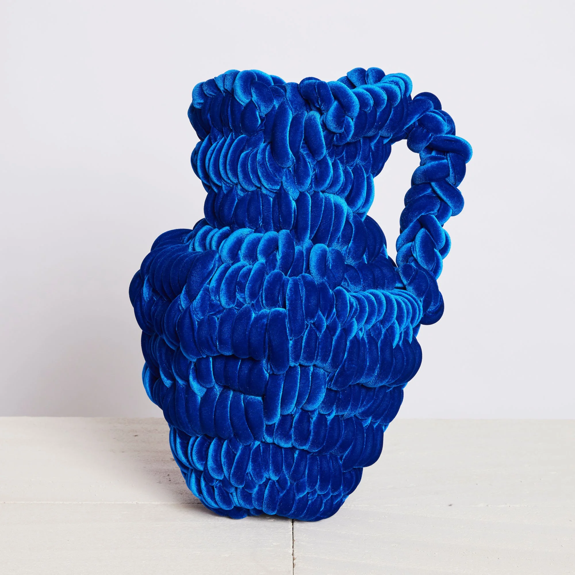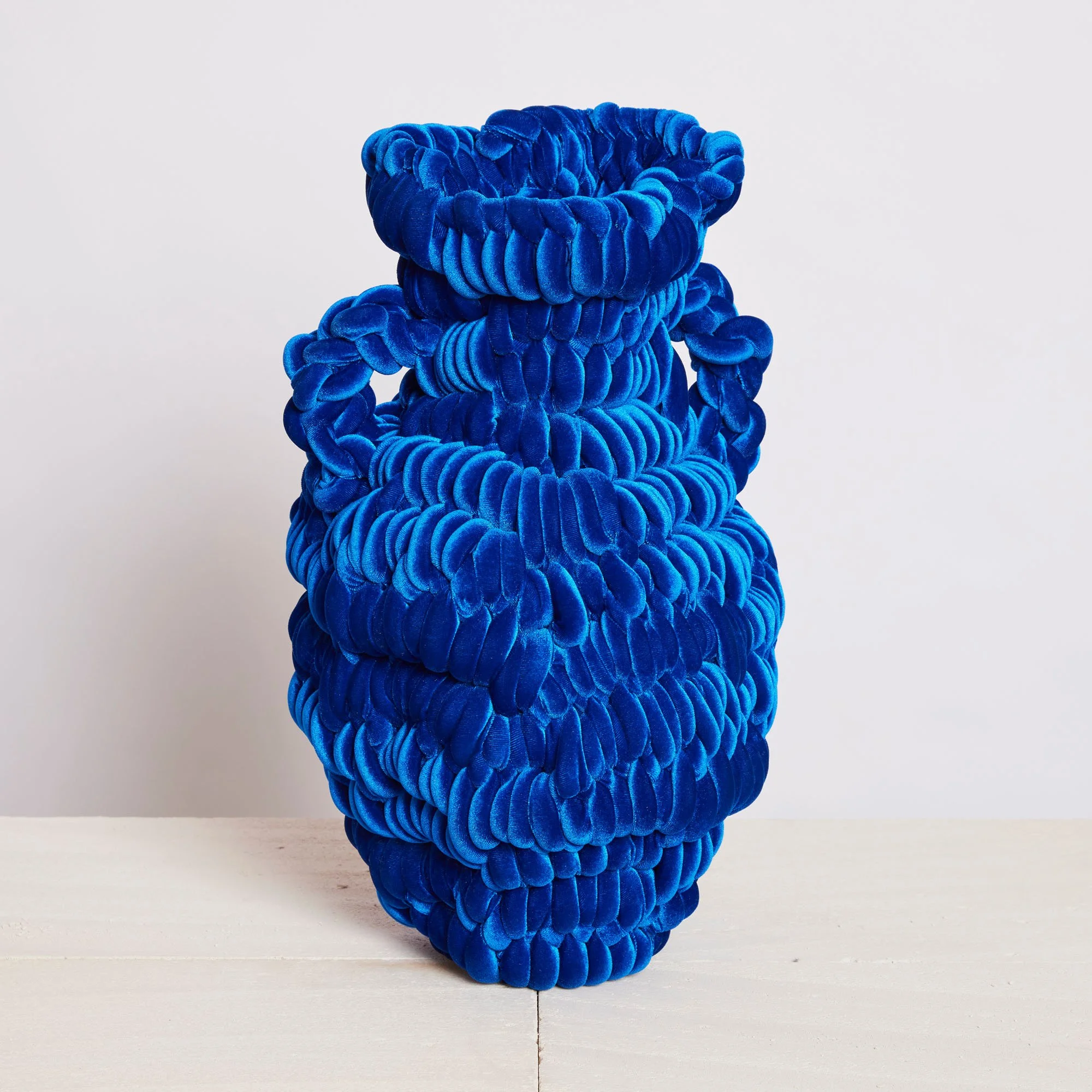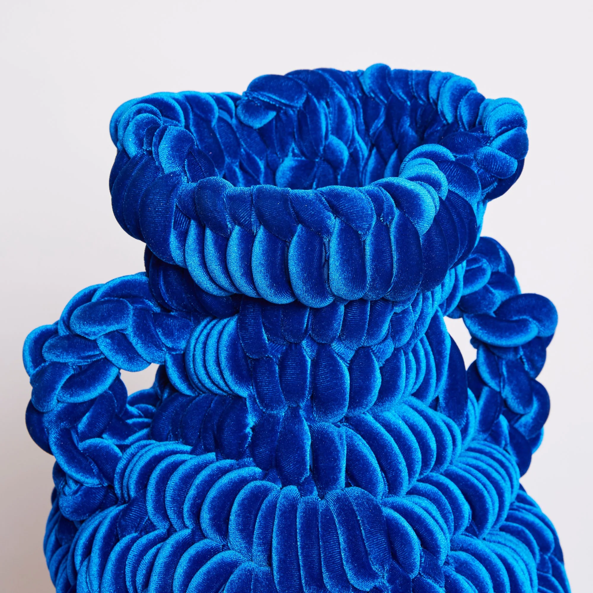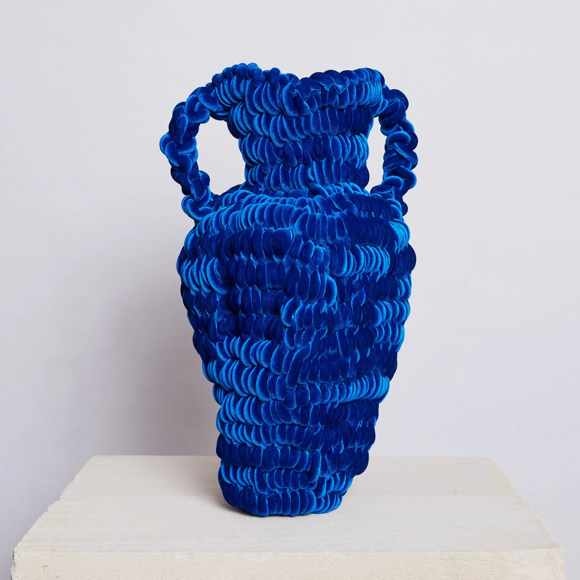 Hand-woven using traditional coil basketry methods, the vessels are created layer by layer, slowly amassing via a stratum of simple loops and knots. The forms of the vessels reference amphorae – two-handled vessels found in antiquities which were commonly used for tasks such as storing wine, milk, or olives. While the original amphorae were often ceramic, the materiality of these velvet vessels honours a utilitarian object at the expense of its usability. By collapsing past forms and present material, the vessels present a divergent cultural legacy for future beings to unearth from the anthropocenic strata.